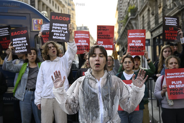Légende : Des militants pour le climat tentent de bloquer l'Assemblée générale des actionnaires du géant pétrolier et gazier TotalEnergies /// Climate activists try to block General Meeting of Shareholders of oil and gas giant TotalEnergies - Paris - 26/05/2023 - Photo © Lionel Préau +33 (0)6 68 12 83 77