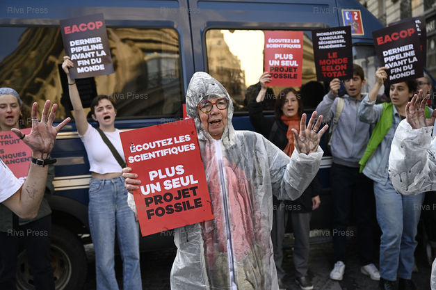 Légende : Des militants pour le climat tentent de bloquer l'Assemblée générale des actionnaires du géant pétrolier et gazier TotalEnergies /// Climate activists try to block General Meeting of Shareholders of oil and gas giant TotalEnergies - Paris - 26/05/2023 - Photo © Lionel Préau +33 (0)6 68 12 83 77