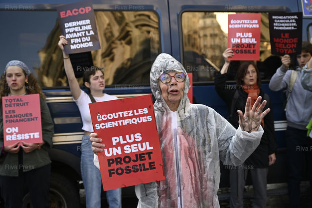 Légende : Des militants pour le climat tentent de bloquer l'Assemblée générale des actionnaires du géant pétrolier et gazier TotalEnergies /// Climate activists try to block General Meeting of Shareholders of oil and gas giant TotalEnergies - Paris - 26/05/2023 - Photo © Lionel Préau +33 (0)6 68 12 83 77