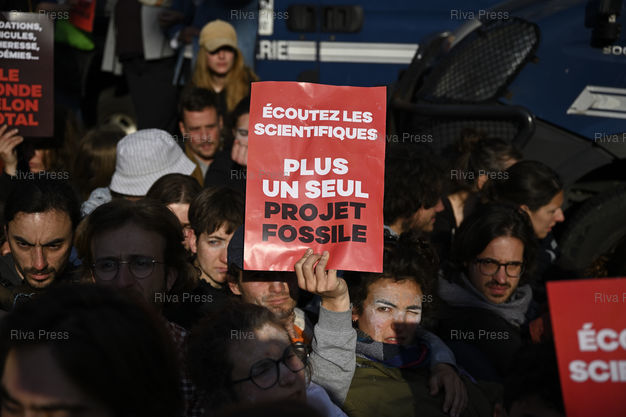 Légende : Des militants pour le climat tentent de bloquer l'Assemblée générale des actionnaires du géant pétrolier et gazier TotalEnergies /// Climate activists try to block General Meeting of Shareholders of oil and gas giant TotalEnergies - Paris - 26/05/2023 - Photo © Lionel Préau +33 (0)6 68 12 83 77