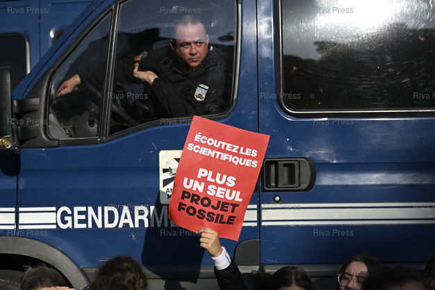 Légende : Des militants pour le climat tentent de bloquer l'Assemblée générale des actionnaires du géant pétrolier et gazier TotalEnergies /// Climate activists try to block General Meeting of Shareholders of oil and gas giant TotalEnergies - Paris - 26/05/2023 - Photo © Lionel Préau +33 (0)6 68 12 83 77