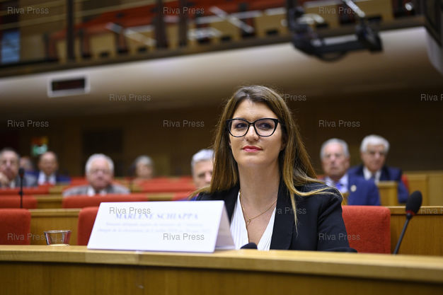Légende : Marlène Schiappa, secrétaire d'Etat chargée de l'Economie sociale et solidaire et de la Vie associative, est auditionnée par la commission d'enquête du Sénat sur l'utilisation du fonds Marianne, lancé à son initiative après l'assassinat de Samuel Paty. Le profil de certaines associations lauréates pose question et une enquête judiciaire a été ouverte /// Marlène Schiappa, junior minister for the Social and Solidarity Economy and Associative Life, is heard by the Senate Committee of Inquiry on the use of the Marianne fund, launched on her initiative after the assassination of Samuel Paty. The profile of some winning associations raises questions and a judicial inquiry has been opened - Paris - 14/06/2023 - Photo © Lionel Préau +33 (0)6 68 12 83 77