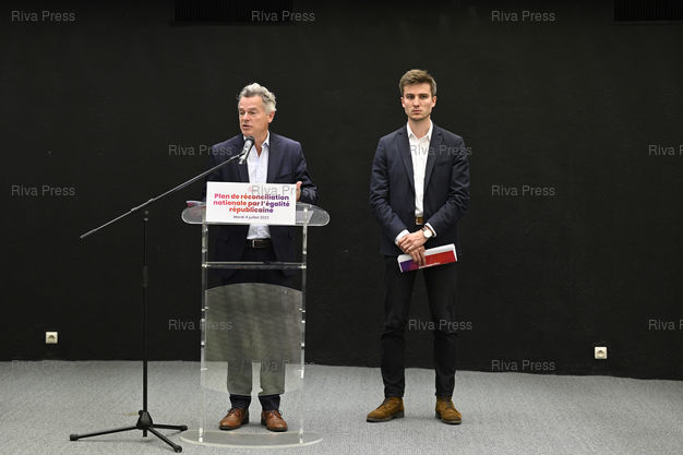 Légende : Fabien Roussel, secrétaire national du Parti communiste français, et Léon Deffontaines, chef de file du PCF aux élections européennes, présentent un Plan de réconciliation nationale par l'égalité républicaine /// Fabien Roussel, National Secretary of the French Communist Party, and Léon Deffontaines, PCF leader in the European elections, present a Plan for National Reconciliation through Republican Equality - Paris - 04/07/2023 - Photo © Lionel Préau +33 (0)6 68 12 83 77
