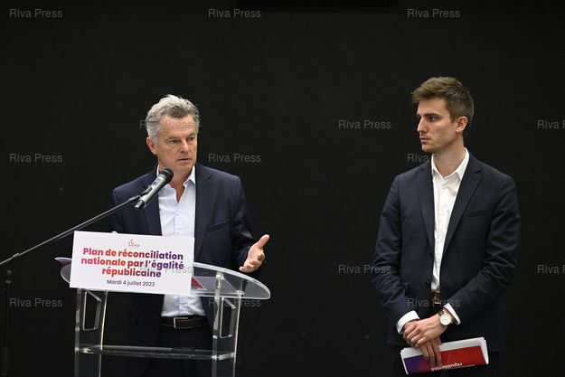 Légende : Fabien Roussel, secrétaire national du Parti communiste français, et Léon Deffontaines, chef de file du PCF aux élections européennes, présentent un Plan de réconciliation nationale par l'égalité républicaine /// Fabien Roussel, National Secretary of the French Communist Party, and Léon Deffontaines, PCF leader in the European elections, present a Plan for National Reconciliation through Republican Equality - Paris - 04/07/2023 - Photo © Lionel Préau +33 (0)6 68 12 83 77