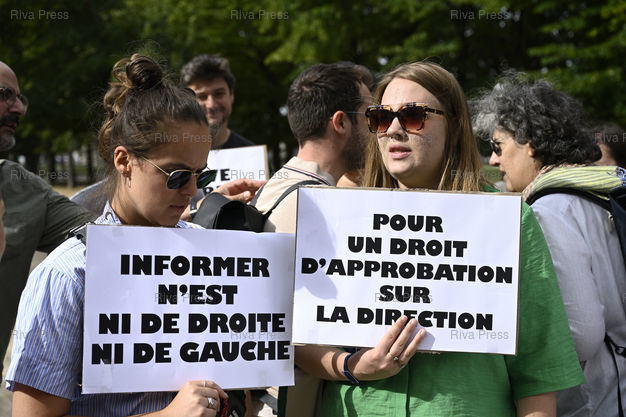 Légende : Rassemblement de la rédaction en grève du Journal du Dimanche (JDD) aux abords de de l'Assemblée nationale, contre l'arrivée à sa tête de Geoffroy Lejeune, ex-directeur de la rédaction du magazine d’extrême droite Valeurs actuelles /// Gathering of the striking editorial staff of the Journal du Dimanche (JDD) near the National Assembly, against the arrival at its head of Geoffroy Lejeune, former editor of the far-right magazine Valeurs actuelles - Paris - 19/07/2023 - Photo © Lionel Préau +33 (0)6 68 12 83 77