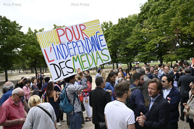 Légende : Rassemblement de la rédaction en grève du Journal du Dimanche (JDD) aux abords de de l'Assemblée nationale, contre l'arrivée à sa tête de Geoffroy Lejeune, ex-directeur de la rédaction du magazine d’extrême droite Valeurs actuelles /// Gathering of the striking editorial staff of the Journal du Dimanche (JDD) near the National Assembly, against the arrival at its head of Geoffroy Lejeune, former editor of the far-right magazine Valeurs actuelles - Paris - 19/07/2023 - Photo © Lionel Préau +33 (0)6 68 12 83 77