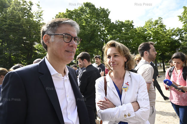 Légende : Rassemblement de la rédaction en grève du Journal du Dimanche (JDD) aux abords de de l'Assemblée nationale, contre l'arrivée à sa tête de Geoffroy Lejeune, ex-directeur de la rédaction du magazine d’extrême droite Valeurs actuelles. Olivier Faure, premier secrétaire du PS - Marylise Léon, secrétaire générale de la CFDT /// Gathering of the striking editorial staff of the Journal du Dimanche (JDD) near the National Assembly, against the arrival at its head of Geoffroy Lejeune, former editor of the far-right magazine Valeurs actuelles. Olivier Faure, First secretary of the Socialist Party (PS) - Marylise Léon, General Secretary of the CFDT union - Paris - 19/07/2023 - Photo © Lionel Préau +33 (0)6 68 12 83 77