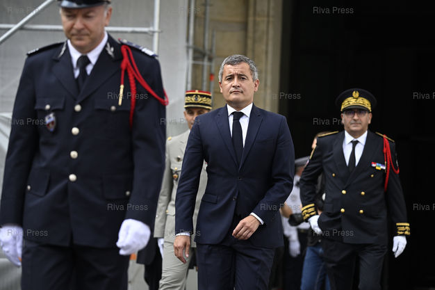 Caption : Gérald Darmanin, ministre de l'Intérieur et des Outre-Mer, se rend à la Prefecture de Police de Paris pour la Cérémonie du 79ème anniversaire de la Libération de Paris. En présence de Laurent Nunez, préfet de police de Paris /// Gérald Darmanin, Minister of the Interior and Overseas, goes to the Prefecture of Police of Paris for the Ceremony of the 79th anniversary of the Liberation of Paris. With Laurent Nunez, Paris police chief - Paris - 24/08/2023 - Photo © Lionel Préau +33 (0)6 68 12 83 77