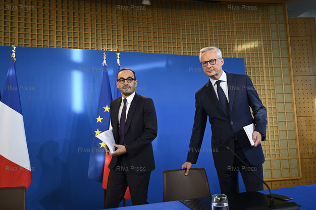 Légende : Bruno Le Maire, ministre de l'Economie, des Finances et de la Souveraineté industrielle et numérique, et Thomas Cazenave, ministre délégué chargé des Comptes publics, présentent le Projet de loi de finances 2024 et la loi de programmation des finances publiques 2023-2027 /// Bruno Le Maire, Minister of the Economy, Finance and Industrial and Digital Sovereignty, and Thomas Cazenave, Junior Minister in charge of Public Accounts, present the 2024 Finance Bill and the 2023-2027 public finance programming law - Paris - 27/09/2023 - Photo © Lionel Préau +33 (0)6 68 12 83 77