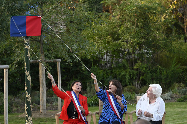 Légende : Inauguration du Jardin des Ambassadeurs - Line Renaud. Jeanne d'Hauteserre, maire du 8eme arrondissement - Anne Hidalgo, maire de Paris - Line Renaud /// Inauguration of the Jardin des Ambassadeurs - Line Renaud. Jeanne d'Hauteserre, major of the 8th arrondissement - Anne Hidalgo, major of Paris - Line Renaud - Paris - 02/10/2023 - Photo © Lionel Préau +33 (0)6 68 12 83 77