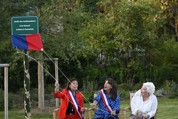 Légende : Inauguration du Jardin des Ambassadeurs - Line Renaud. Jeanne d'Hauteserre, maire du 8eme arrondissement - Anne Hidalgo, maire de Paris - Line Renaud /// Inauguration of the Jardin des Ambassadeurs - Line Renaud. Jeanne d'Hauteserre, major of the 8th arrondissement - Anne Hidalgo, major of Paris - Line Renaud - Paris - 02/10/2023 - Photo © Lionel Préau +33 (0)6 68 12 83 77
