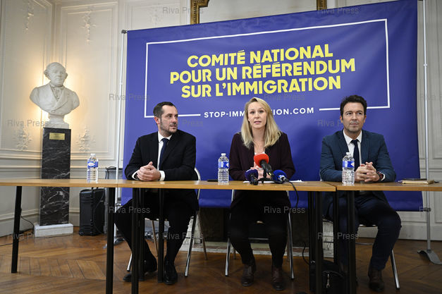 Légende : Marion Maréchal, tête de liste Reconquête! pour les élections européennes, présente le lancement d'un « comité national pour un référendum sur l'immigration » lors d'une conférence de presse, avec pour objectif l'organisation d'un Référendum d'initiative partagée. En présence de Nicolas Bay et Guillaume Peltier /// Marion Maréchal, head of the Reconquete! far-right list for the European elections, presents the launch of a “national committee for a referendum on immigrationî during a press conference, with the aim of organizing a Shared Initiative Referendum. With Nicolas Bay and Guillaume Peltier - Paris - 06/11/2023 - Photo © Lionel Préau +33 (0)6 68 12 83 77