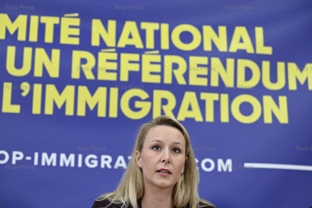 Légende : Marion Maréchal, tête de liste Reconquête! pour les élections européennes, présente le lancement d'un « comité national pour un référendum sur l'immigration » lors d'une conférence de presse, avec pour objectif l'organisation d'un Référendum d'initiative partagée /// Marion Maréchal, head of the Reconquete! far-right list for the European elections, presents the launch of a “national committee for a referendum on immigrationî during a press conference, with the aim of organizing a Shared Initiative Referendum - Paris - 06/11/2023 - Photo © Lionel Préau +33 (0)6 68 12 83 77