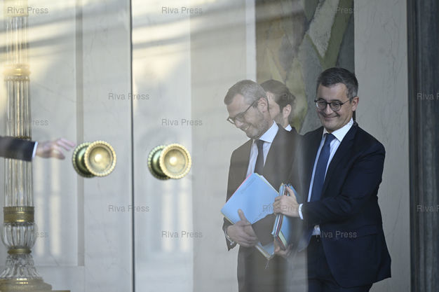 Légende : Conseil des ministres au palais de l'Elysée. Alexis Kohler, Secrétaire général de l'Elysée - Gérald Darmanin, ministre de l'Intérieur et des Outre-mer /// Cabinet meeting at the Elysee Palace. Alexis Kohler, Secretary General of the Elysee - Gérald Darmanin, Minister of the Interior and Overseas - Paris - 20/12/2023 - Photo © Lionel Préau +33 (0)6 68 12 83 77