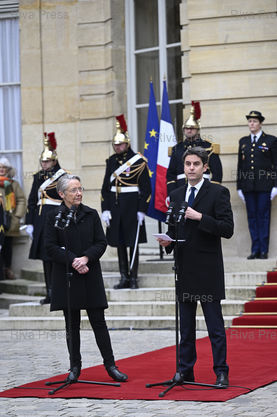 Légende : Passation des pouvoirs au poste de Premier ministre entre Elisabeth Borne et Gabriel Attal /// Handover Ceremony for the French Prime Minister between Elisabeth Borne and Gabriel Attal - Paris - 09/01/2024 - Photo © Lionel Préau +33 (0)6 68 12 83 77