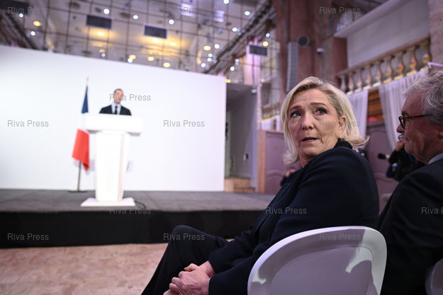 Légende : Jordan Bardella, président du Rassemblement National, député européen, présente ses voeux à la presse. Marine Le Pen, présidente du groupe RN à l'Assemblée nationale /// Jordan Bardella, president of the Rassemblement National, MEP, presents his best wishes for the new year. Marine Le Pen, President of the RN group at the National assembly - Paris - 15/01/2024 - Photo © Lionel Préau +33 (0)6 68 12 83 77