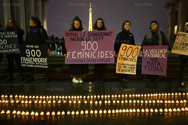 Légende : Rassemblement à l'appel du collectif féministe #Noustoutes en mémoire des 900 victimes de féminicides commis pendant les deux quinquennats Macron - Parvis du Trocadéro /// Rally at the call of the feminist collective #Noustoutes in memory of the 900 victims of feminicides committed during the two five-year Macron terms - Parvis du Trocadéro - Paris - 08/02/2024 - Photo © Lionel Préau +33 (0)6 68 12 83 77