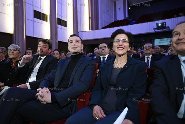 Légende : "États généraux de l'immigration" organisés par le Rassemblement national. Jordan Bardella, président du RN, et Malika Sorel, n°2 sur la liste du RN pour les élections européennes /// “General States of Immigrationî organized by the far-right Rassemblement National party. Jordan Bardella, President of the RN, MEP, and Malika Sorel, n°2 on the RN list for the European elections - Paris - 26/03/2024 - Photo © Lionel Préau +33 (0)6 68 12 83 77