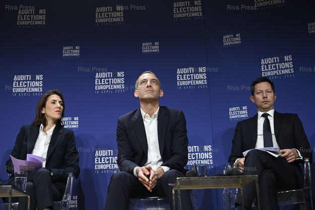 Légende : Le MEDEF auditionne les têtes de listes aux élections européennes. Valérie Hayer (Renaissance) - Raphaël Glucksmann (PS-Place publique) - François-Xavier Bellamy (LR) /// The MEDEF, first network of entrepreneurs in France, is auditioning the heads of the lists in the European elections. Valérie Hayer (Renaissance) - Raphaël Glucksmann (PS-Place publique) - François-Xavier Bellamy (LR) - Paris - 18/04/2024 - Photo © Lionel Préau +33 (0)6 68 12 83 77