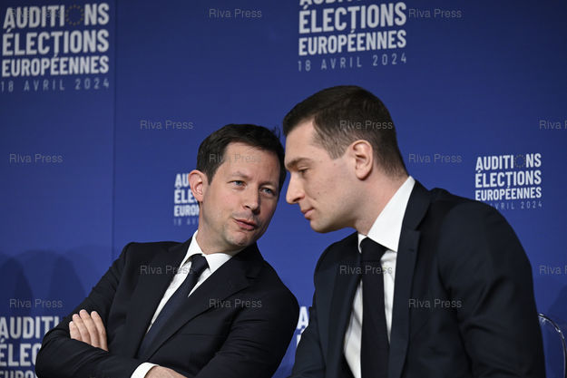 Légende : Le MEDEF auditionne les têtes de listes aux élections européennes. François-Xavier Bellamy (LR) - Jordan Bardella (RN) /// The MEDEF, first network of entrepreneurs in France, is auditioning the heads of the lists in the European elections. François-Xavier Bellamy (LR) - Jordan Bardella (RN) - Paris - 18/04/2024 - Photo © Lionel Préau +33 (0)6 68 12 83 77