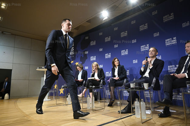 Légende : Le MEDEF auditionne les têtes de listes aux élections européennes. Jordan Bardella (RN) - Marie Toussaint (Les écologistes) - Marion Maréchal (Reconquête) - Valérie Hayer (Renaissance) - Raphaël Glucksmann (PS-Place publique) - François-Xavier Bellamy (LR)/// The MEDEF, first network of entrepreneurs in France, is auditioning the heads of the lists in the European elections. Jordan Bardella (RN) - Marie Toussaint (Les écologistes) - Marion Maréchal (Reconquête) - Valérie Hayer (Renaissance) - Raphaël Glucksmann (PS-Place publique) - François-Xavier Bellamy (LR) - Paris - 18/04/2024 - Photo © Lionel Préau +33 (0)6 68 12 83 77