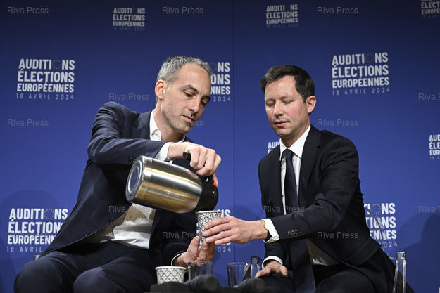 Caption : Le MEDEF auditionne les têtes de listes aux élections européennes. Raphaël Glucksmann (PS-Place publique) - François-Xavier Bellamy (LR) /// The MEDEF, first network of entrepreneurs in France, is auditioning the heads of the lists in the European elections. Raphaël Glucksmann (PS-Place publique) - François-Xavier Bellamy (LR) - Paris - 18/04/2024 - Photo © Lionel Préau +33 (0)6 68 12 83 77