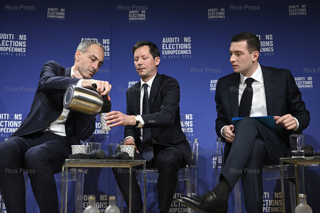 Caption : Le MEDEF auditionne les têtes de listes aux élections européennes. Raphaël Glucksmann (PS-Place publique) - François-Xavier Bellamy (LR) - Jordan Bardella (RN) /// The MEDEF, first network of entrepreneurs in France, is auditioning the heads of the lists in the European elections. Raphaël Glucksmann (PS-Place publique) - François-Xavier Bellamy (LR) - Jordan Bardella (RN) - Paris - 18/04/2024 - Photo © Lionel Préau +33 (0)6 68 12 83 77