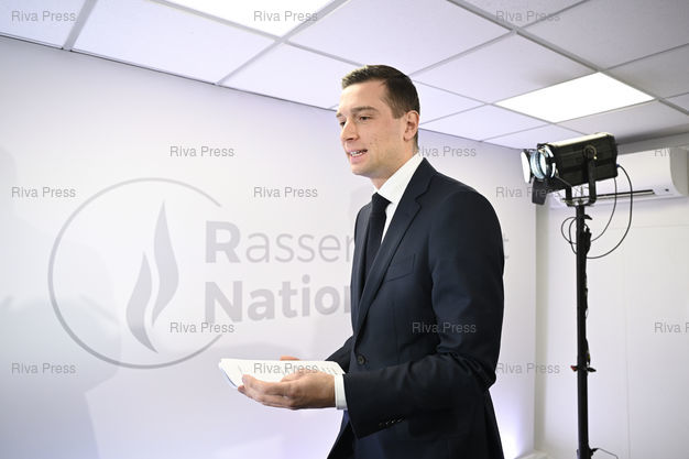 Légende : Jordan Bardella, président du RN, présente le projet du parti pour les élections européennes /// Jordan Bardella, president of the Rassemblement National far-right party, presents the party's project for the European elections - Paris - 25/04/2024 - Photo © Lionel Préau +33 (0)6 68 12 83 77
