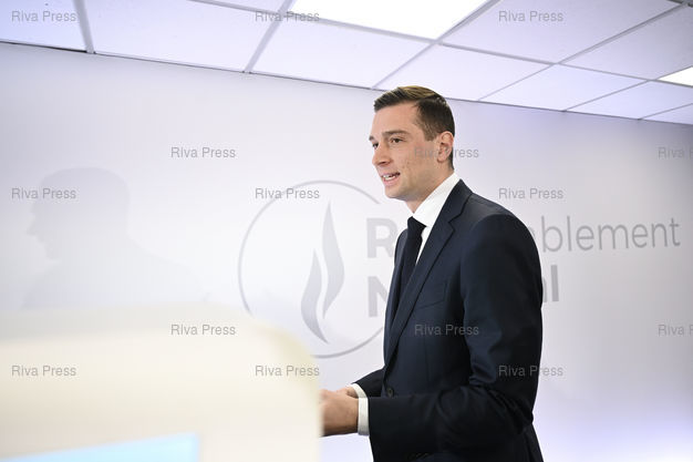 Légende : Jordan Bardella, président du RN, présente le projet du parti pour les élections européennes /// Jordan Bardella, president of the Rassemblement National far-right party, presents the party's project for the European elections - Paris - 25/04/2024 - Photo © Lionel Préau +33 (0)6 68 12 83 77