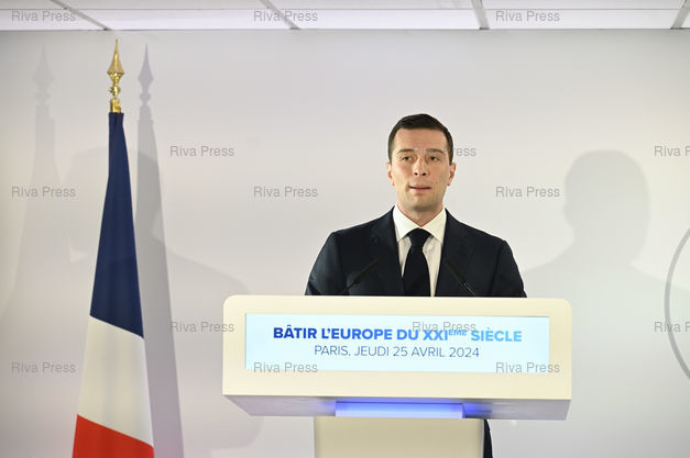 Caption : Jordan Bardella, président du RN, présente le projet du parti pour les élections européennes /// Jordan Bardella, president of the Rassemblement National far-right party, presents the party's project for the European elections - Paris - 25/04/2024 - Photo © Lionel Préau +33 (0)6 68 12 83 77