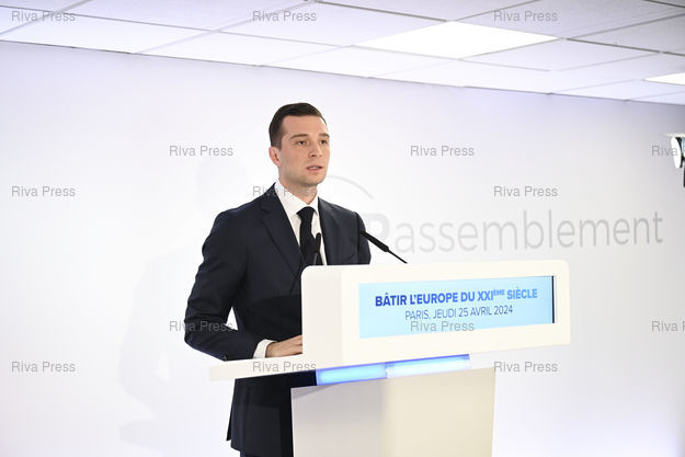 Caption : Jordan Bardella, président du RN, présente le projet du parti pour les élections européennes /// Jordan Bardella, president of the Rassemblement National far-right party, presents the party's project for the European elections - Paris - 25/04/2024 - Photo © Lionel Préau +33 (0)6 68 12 83 77