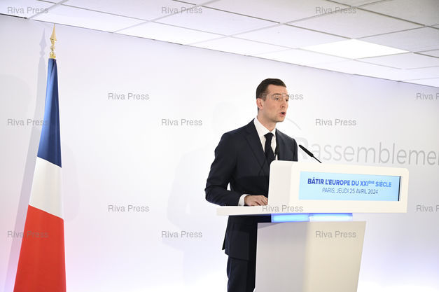 Caption : Jordan Bardella, président du RN, présente le projet du parti pour les élections européennes /// Jordan Bardella, president of the Rassemblement National far-right party, presents the party's project for the European elections - Paris - 25/04/2024 - Photo © Lionel Préau +33 (0)6 68 12 83 77