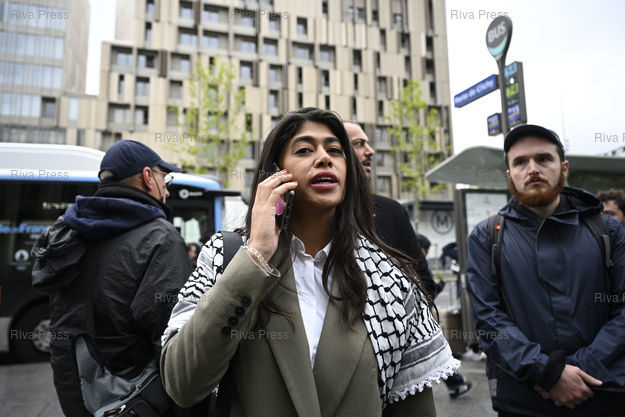 Légende : Rassemblement de La France Insoumise suite aux convocations pour apologie du terrorisme de Mathilde Panot et Rima Hassan. Rima Hassan, candidate aux élections européennes /// Rally of La France Insoumise following the summons for advocating terrorism by Mathilde Panot and Rima Hassan. Rima Hassan, candidate to the European elections - Paris - 30/04/2024 - Photo © Lionel Préau +33 (0)6 68 12 83 77