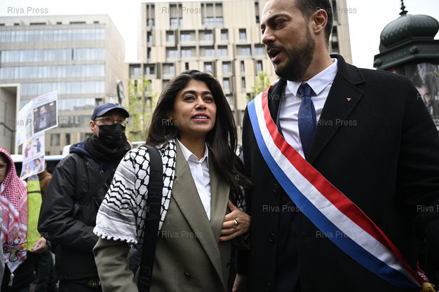 Légende : Rassemblement de La France Insoumise suite aux convocations pour apologie du terrorisme de Mathilde Panot et Rima Hassan. Rima Hassan, candidate aux élections européennes /// Rally of La France Insoumise following the summons for advocating terrorism by Mathilde Panot and Rima Hassan. Rima Hassan, candidate to the European elections - Paris - 30/04/2024 - Photo © Lionel Préau +33 (0)6 68 12 83 77