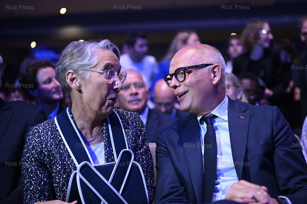 Légende : Meeting de campagne de la majorité présidentielle pour les élections européennes à la Maison de la Mutualité. Elisabeth Borne - Edouard Philippe /// Campaign meeting of the presidential majority for the European elections at the Maison de la Mutualité. Elisabeth Borne, former Prime Minister - Edouard Philippe, former prime minister - Paris - 07/05/2024 - Photo © Lionel Préau +33 (0)6 68 12 83 77