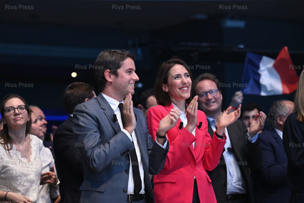 Légende : Meeting de campagne de la majorité présidentielle pour les élections européennes à la Maison de la Mutualité. Gabriel Attal - Valérie Hayer /// Campaign meeting of the presidential majority for the European elections at the Maison de la Mutualité. Gabriel Attal, prime minister - Valérie Hayer, head of list - Paris - 07/05/2024 - Photo © Lionel Préau +33 (0)6 68 12 83 77