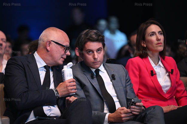 Légende : Meeting de campagne de la majorité présidentielle pour les élections européennes à la Maison de la Mutualité. Edouard Philippe - Gabriel Attal - Valérie Hayer /// Campaign meeting of the presidential majority for the European elections at the Maison de la Mutualité. Edouard Philippe, former prime minister - Gabriel Attal, prime minister - Valérie Hayer, head of list - Paris - 07/05/2024 - Photo © Lionel Préau +33 (0)6 68 12 83 77