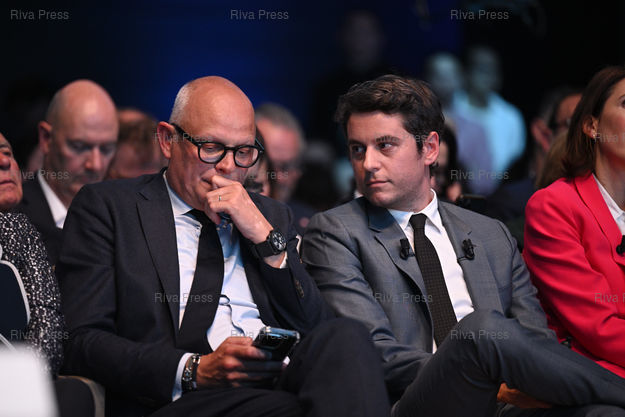 Légende : Meeting de campagne de la majorité présidentielle pour les élections européennes à la Maison de la Mutualité. Edouard Philippe - Gabriel Attal /// Campaign meeting of the presidential majority for the European elections at the Maison de la Mutualité. Edouard Philippe, former prime minister - Gabriel Attal, prime minister - Paris - 07/05/2024 - Photo © Lionel Préau +33 (0)6 68 12 83 77