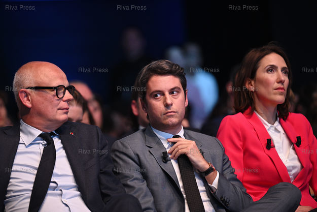 Légende : Meeting de campagne de la majorité présidentielle pour les élections européennes à la Maison de la Mutualité. Edouard Philippe - Gabriel Attal - Valérie Hayer /// Campaign meeting of the presidential majority for the European elections at the Maison de la Mutualité. Edouard Philippe, former prime minister - Gabriel Attal, prime minister - Valérie Hayer, head of list - Paris - 07/05/2024 - Photo © Lionel Préau +33 (0)6 68 12 83 77