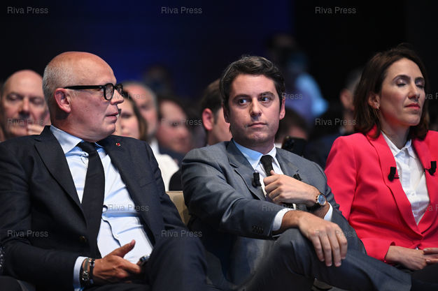 Légende : Meeting de campagne de la majorité présidentielle pour les élections européennes à la Maison de la Mutualité. Edouard Philippe - Gabriel Attal - Valérie Hayer /// Campaign meeting of the presidential majority for the European elections at the Maison de la Mutualité. Edouard Philippe, former prime minister - Gabriel Attal, prime minister - Valérie Hayer, head of list - Paris - 07/05/2024 - Photo © Lionel Préau +33 (0)6 68 12 83 77