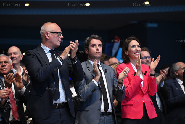 Légende : Meeting de campagne de la majorité présidentielle pour les élections européennes à la Maison de la Mutualité. Edouard Philippe - Gabriel Attal - Valérie Hayer /// Campaign meeting of the presidential majority for the European elections at the Maison de la Mutualité. Edouard Philippe, former prime minister - Gabriel Attal, prime minister - Valérie Hayer, head of list - Paris - 07/05/2024 - Photo © Lionel Préau +33 (0)6 68 12 83 77