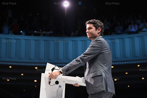 Légende : Meeting de campagne de la majorité présidentielle pour les élections européennes à la Maison de la Mutualité. Gabriel Attal /// Campaign meeting of the presidential majority for the European elections at the Maison de la Mutualité. Gabriel Attal, prime minister - Paris - 07/05/2024 - Photo © Lionel Préau +33 (0)6 68 12 83 77