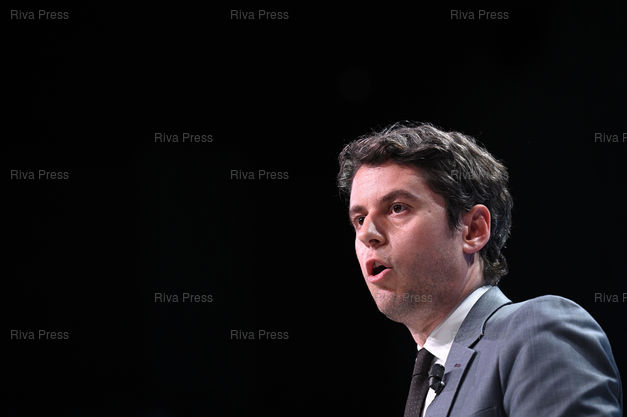 Légende : Meeting de campagne de la majorité présidentielle pour les élections européennes à la Maison de la Mutualité. Gabriel Attal /// Campaign meeting of the presidential majority for the European elections at the Maison de la Mutualité. Gabriel Attal, prime minister - Paris - 07/05/2024 - Photo © Lionel Préau +33 (0)6 68 12 83 77
