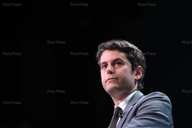 Légende : Meeting de campagne de la majorité présidentielle pour les élections européennes à la Maison de la Mutualité. Gabriel Attal /// Campaign meeting of the presidential majority for the European elections at the Maison de la Mutualité. Gabriel Attal, prime minister - Paris - 07/05/2024 - Photo © Lionel Préau +33 (0)6 68 12 83 77