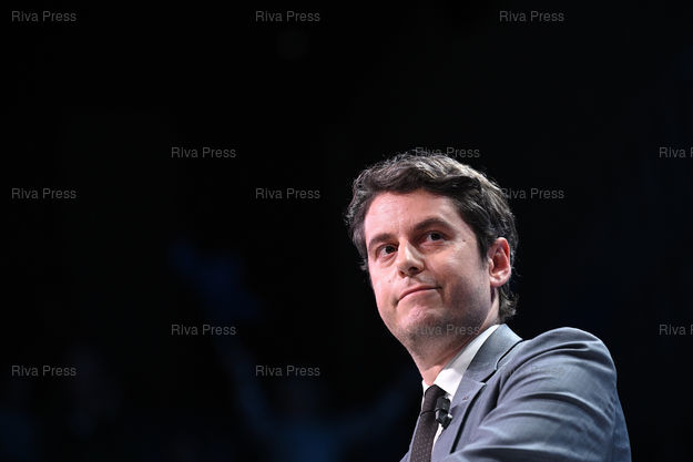 Légende : Meeting de campagne de la majorité présidentielle pour les élections européennes à la Maison de la Mutualité. Gabriel Attal /// Campaign meeting of the presidential majority for the European elections at the Maison de la Mutualité. Gabriel Attal, prime minister - Paris - 07/05/2024 - Photo © Lionel Préau +33 (0)6 68 12 83 77