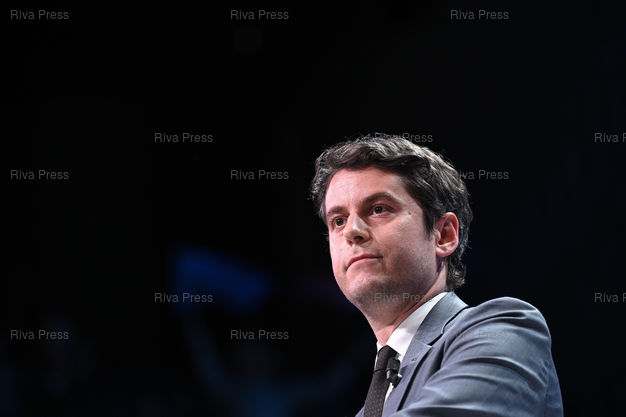 Légende : Meeting de campagne de la majorité présidentielle pour les élections européennes à la Maison de la Mutualité. Gabriel Attal /// Campaign meeting of the presidential majority for the European elections at the Maison de la Mutualité. Gabriel Attal, prime minister - Paris - 07/05/2024 - Photo © Lionel Préau +33 (0)6 68 12 83 77