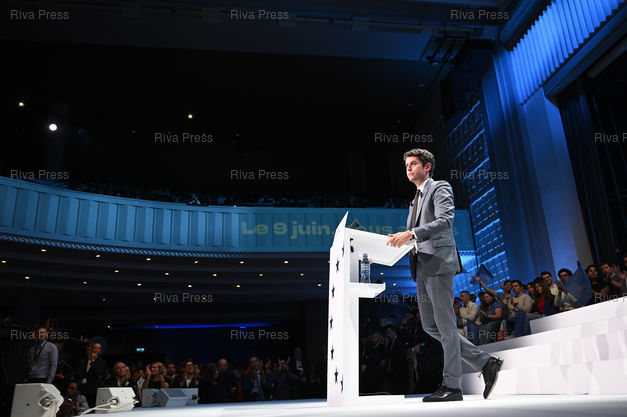 Légende : Meeting de campagne de la majorité présidentielle pour les élections européennes à la Maison de la Mutualité. Gabriel Attal /// Campaign meeting of the presidential majority for the European elections at the Maison de la Mutualité. Gabriel Attal, prime minister - Paris - 07/05/2024 - Photo © Lionel Préau +33 (0)6 68 12 83 77