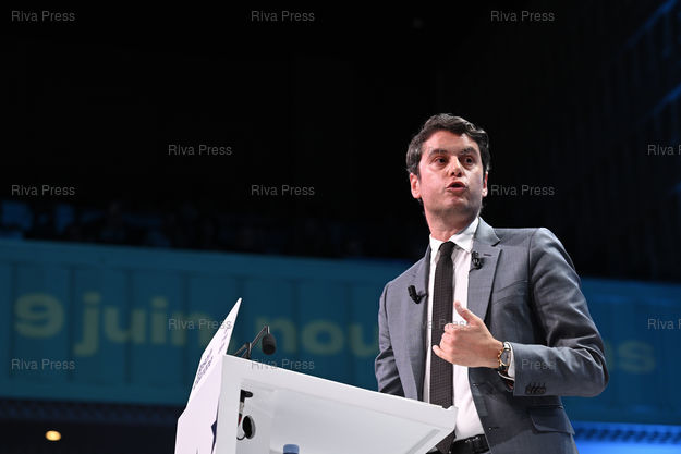Légende : Meeting de campagne de la majorité présidentielle pour les élections européennes à la Maison de la Mutualité. Gabriel Attal /// Campaign meeting of the presidential majority for the European elections at the Maison de la Mutualité. Gabriel Attal, prime minister - Paris - 07/05/2024 - Photo © Lionel Préau +33 (0)6 68 12 83 77
