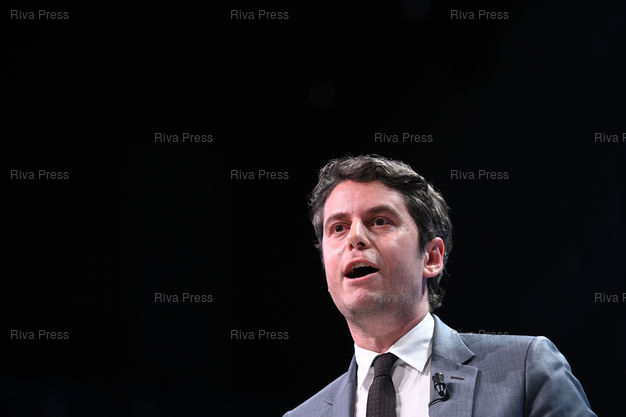 Légende : Meeting de campagne de la majorité présidentielle pour les élections européennes à la Maison de la Mutualité. Gabriel Attal /// Campaign meeting of the presidential majority for the European elections at the Maison de la Mutualité. Gabriel Attal, prime minister - Paris - 07/05/2024 - Photo © Lionel Préau +33 (0)6 68 12 83 77
