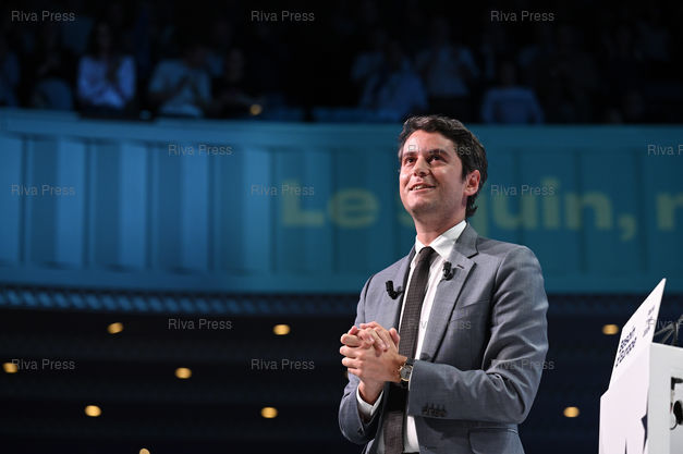 Légende : Meeting de campagne de la majorité présidentielle pour les élections européennes à la Maison de la Mutualité. Gabriel Attal /// Campaign meeting of the presidential majority for the European elections at the Maison de la Mutualité. Gabriel Attal, prime minister - Paris - 07/05/2024 - Photo © Lionel Préau +33 (0)6 68 12 83 77